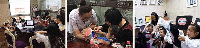 本次活动共有8组家庭参加爱牙亲子活动,工作人员带领家长和小朋友们来到了三楼,由康贝佳口腔医生向大家介绍了儿童护齿的要点,并一对一地指导小朋友们如何正确刷牙。