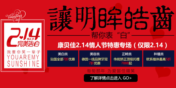 情人节是一个让甜蜜恋情不断升温的盛大节日,不论你是正在热恋的小情侣还是相恋多年的老夫老妻,都要在情人节那天充满自信,大声对TA喊出我爱你!可是不整齐又有些发黄的牙齿倾刻间令……【详细】