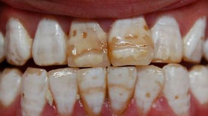 牙齿先天或后天的病变、药物的影响导致的牙齿内部结构发生着色,比如「氟斑牙」、「四环素牙」。