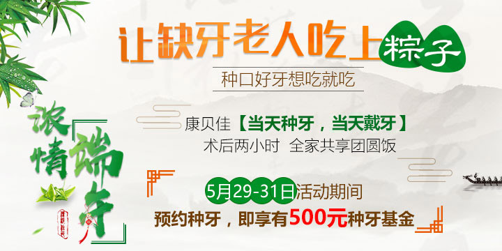 康贝佳口腔在端午佳节来临之际,特推出“让缺牙老人重新吃上粽子”特惠活动周,优良品牌植体折扣喜人。同时,种牙患者可免费享受保险提供的种植体5年非意外质保,术后所有植体维修等费用全由保险承担,机会有限,预约从速!